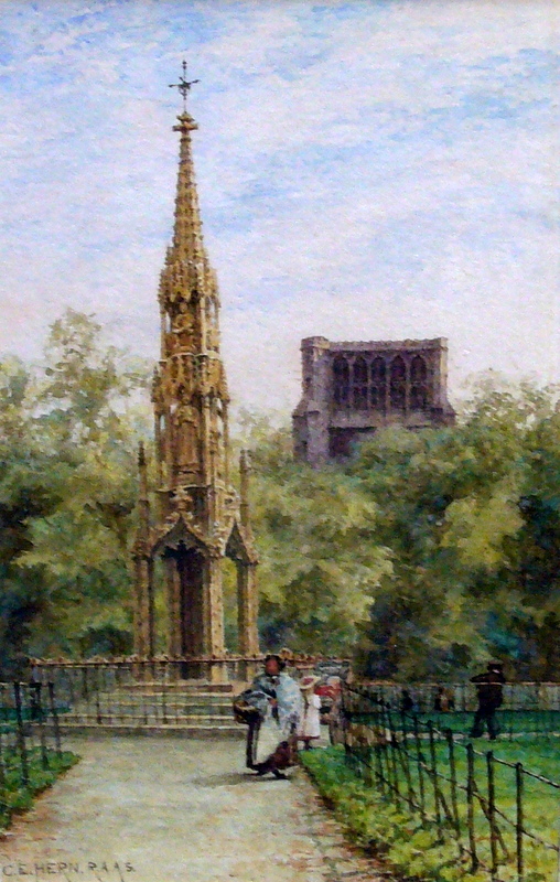 The Cross replacement project had been initiated at a public meeting on 22 September 1848, when it was decided to raise a public subscription for the purpose. An account of the laying of the foundation stone appeared in the Bristol Mercury on 10 August 1850: ‘The citizens were having restored to them, on that day an heir-loom long cherished, long neglected, and long lost, a monument of their city’s antiquity, though three generations have passed away since it was standing erect within its walls.’ The Cross was completed in 1851, but it was several years before all the statues were added. The Freemasons of the city donated a figure of Edward III in 1855, and the remaining seven statues were installed in 1889 – the year before this watercolour was painted. A year earlier, in 1888, the Cross had been moved nearer the centre of College Green, to make way for the statue of Queen Victoria erected to commemorate the Golden Jubilee of 1887.