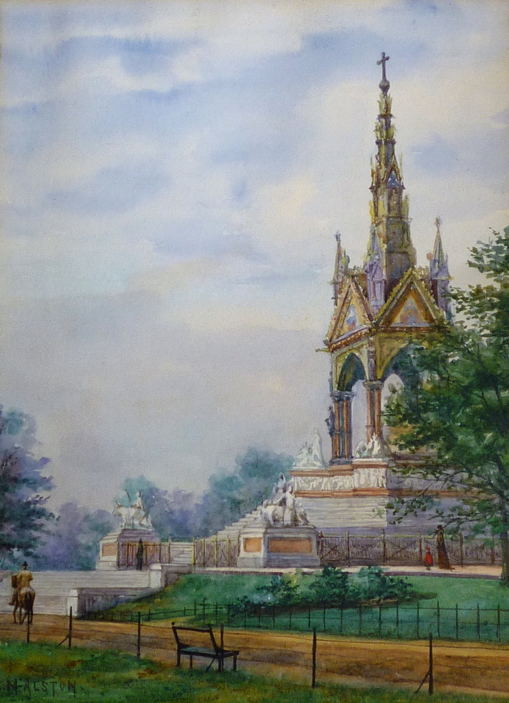 The Albert Memorial, Hyde Park, London. The Albert Memorial was designed by Sir George Gilbert Scott and completed in 1872, with the giant seated statue of Prince Albert by John H. Foley added in 1876. The memorial to Prince Albert, who died in 1861, remains the supreme example of High Victorian decorative art. The monument is enriched with much sculpture and is decorated with mosaic, enamel and other techniques. Around the memorial are sculptured groups representing the industrial arts: Agriculture, Manufacture, Commerce and Engineering. At the base of the stepped podium, linked by elaborate railings, are four further sculptured groups representing Europe, Asia, Africa and America.