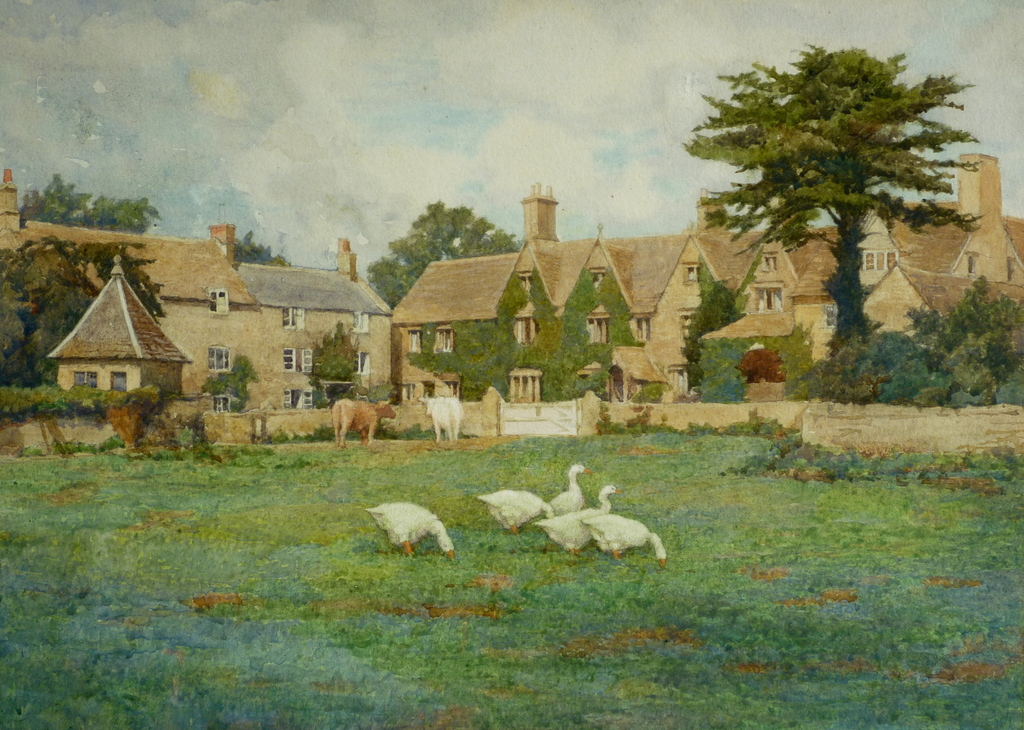 A watercolour measuring 10” x 13½”. Provenance: exhibited in March-May 1923 at the Royal Institute of Painters in Water Colours, Piccadilly, London as No. 90 ‘Westhall Hill Manor’ (label verso). Sometime with George W. Rodway, Kensington, London (2nd label verso).