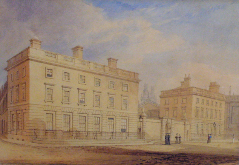 Magdalen Hall, Oxford. The two well-proportioned classical blocks shown in this watercolour were designed in 1820-22 by William Garbett (c.1770-1834), for 25 years surveyor to the Dean and Chapter of Winchester. Located on Catte Street opposite the Bodleian Library, they were originally built for the principal and students of Magdalen Hall; this ceased to exist in 1874, when Hertford College was revived on the site. The buildings now form part of the west front of Hertford College. The low wall and lodge between the two blocks were demolished in 1887-8 to make way for the present Hall.