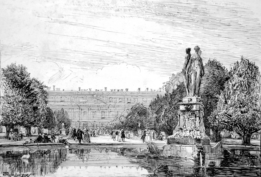 Hampton Court Palace. This is a view of the palace and gardens from the east. In the background is the stately Baroque façade designed by Sir Christopher Wren in the 17th century. The statue of the Three Graces in the forefront is shown in its original capacity as a fountain; it has since been removed to the gardens. The statue is an early 19th century copy of the memorial to Henry II of France, now in the Louvre.