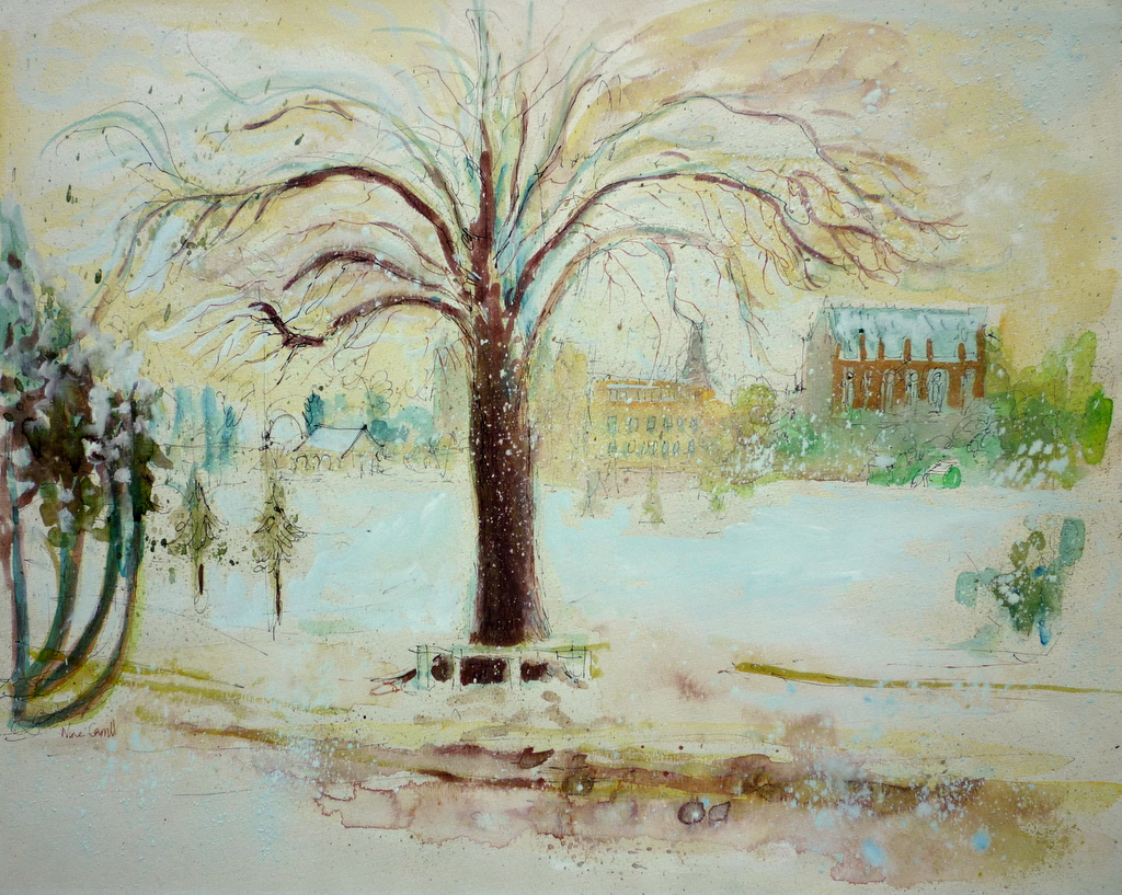 A wintery scene at Oxford University Parks. The buildings in the view are…
