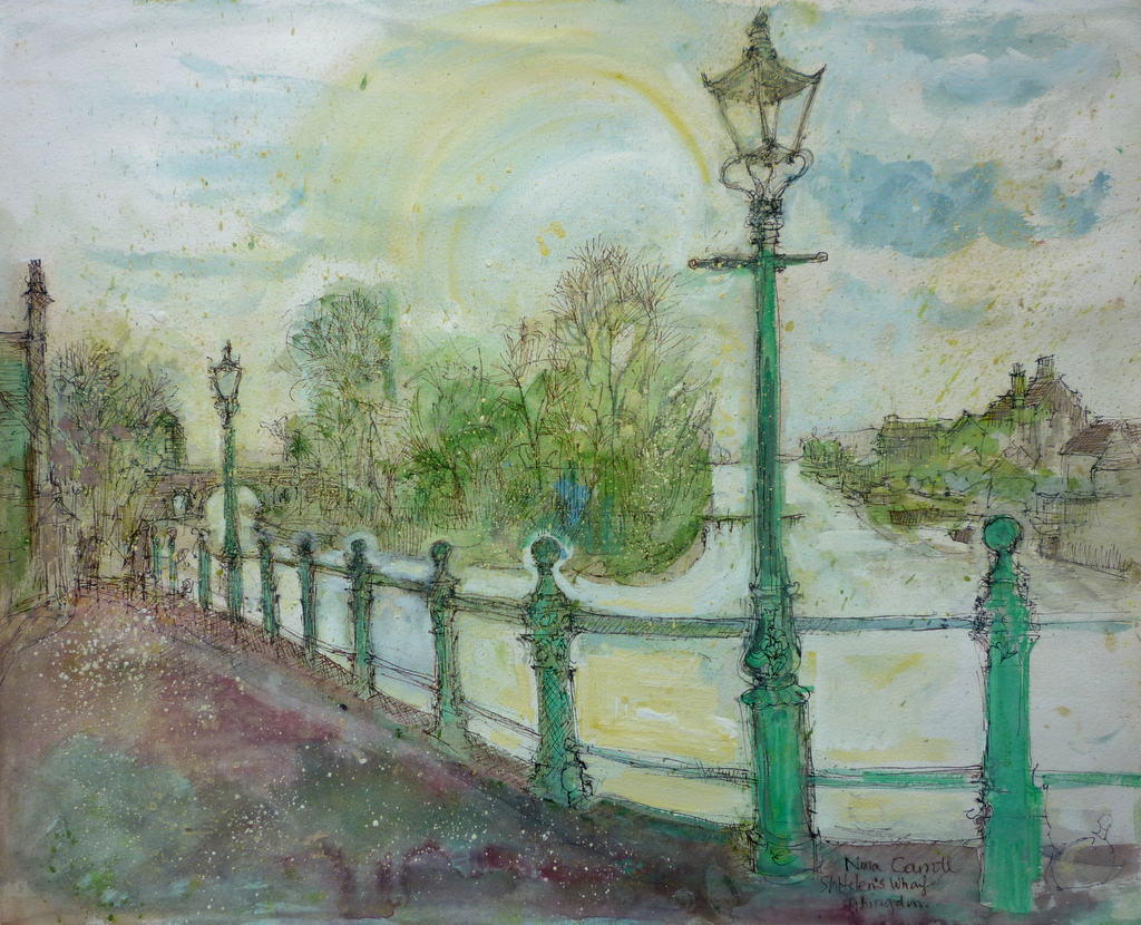 A pen, ink and watercolour measuring 15¼” x 19”. Signed Nina Carroll and inscribed ‘St Helen’s Wharf, Abingdon’.