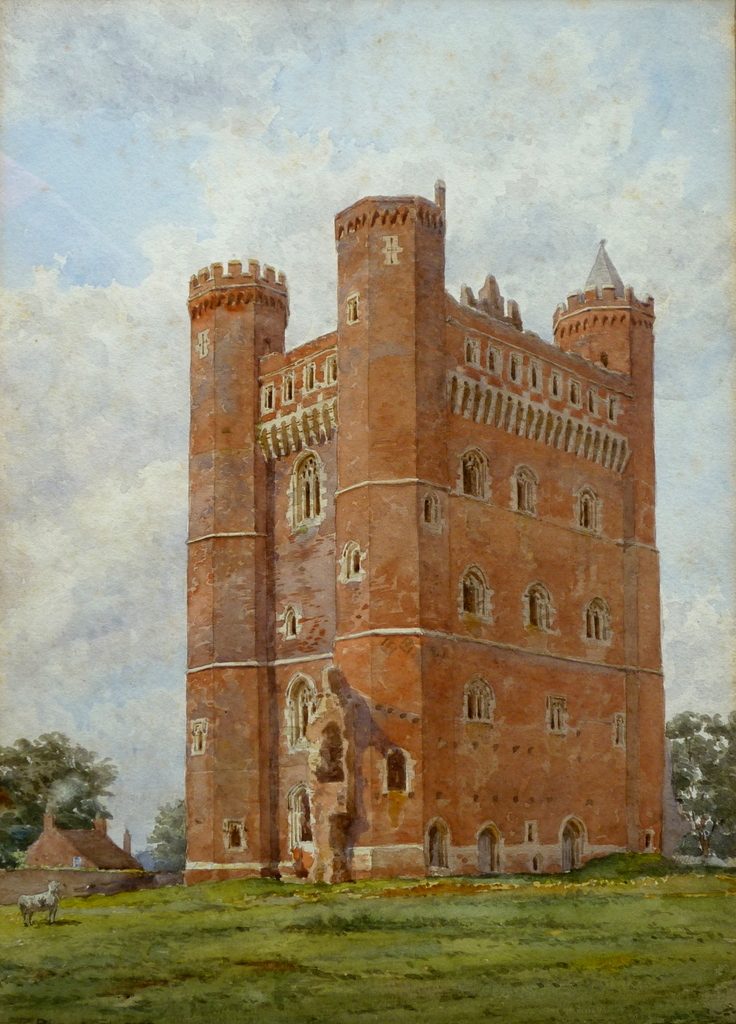 …important surviving 15th century red-brick castle rising dramatically above the Lincolnshire countryside. It was built by Ralph Cromwell, Lord Treasurer of England, in 1434-1447 as a display of his wealth and power in unstable times. It went through many phases in its long history, from a palatial dwelling to a cattle shed and a romantic ruin. When it was put up for sale in 1910 the huge medieval fireplaces were ripped out. Lord Curzon of Kedleston stepped in at the eleventh hour to buy the Castle and he restored it, including putting back the medieval fireplaces. He left it to the National Trust on his death in 1925. This painting shows Tattershall Castle before Lord Curzon undertook the restorations of 1911-1914.