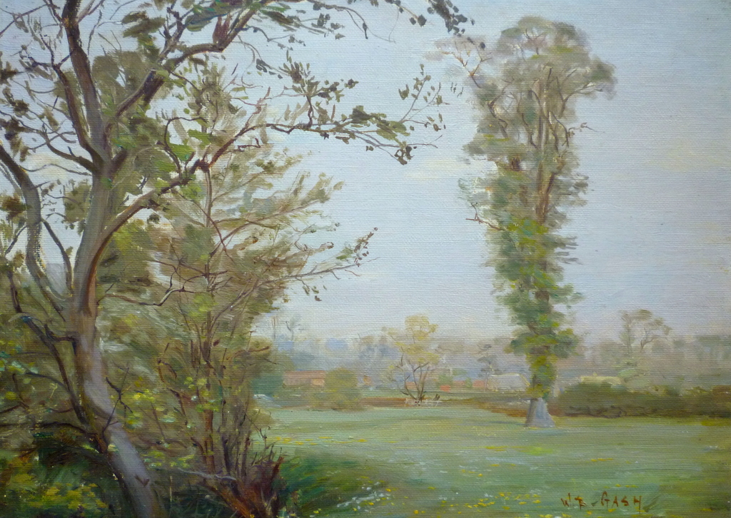 An oil on canvas laid on board, measuring 9½” x 13½”. Signed W. B. Gash.